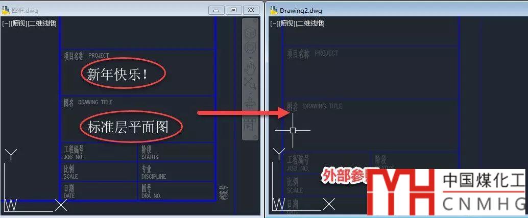 問(wèn)題的原因其實(shí)很簡(jiǎn)單,他的圖框是一個(gè)圖框的塊文件,適合作為圖塊將圖框插入到其他圖紙,圖框中有一些需要編輯和修改的文字被設(shè)置成了屬性文字,當(dāng)作為外部參照插入到其他圖紙的時(shí)候,這些文字就消失了,如下圖所示。
