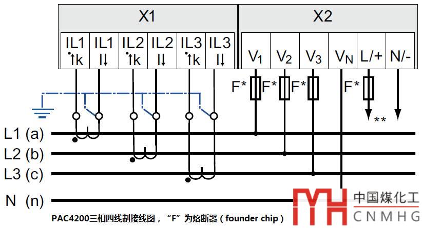這里我們以"3P4W非平衡負載"為例來講解PAC4200的接線(現(xiàn)場設備中的電機、變壓器等都屬于非平衡負載),如下圖: