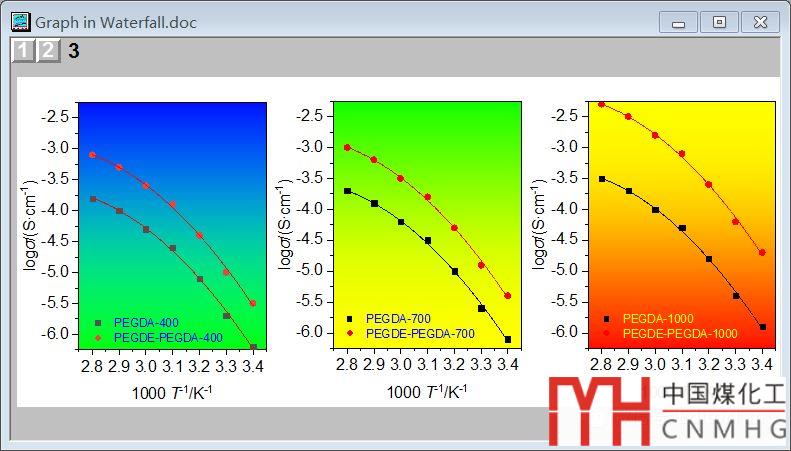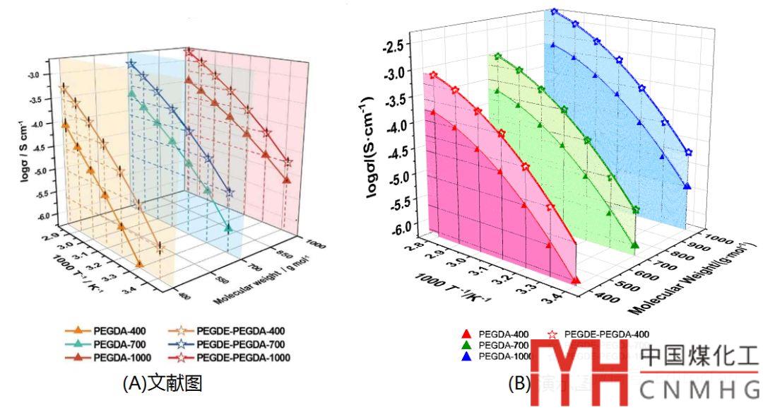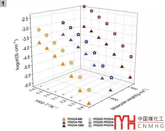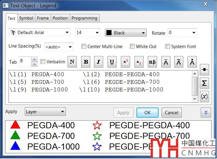 例如本案例中,用▲表示PEGDA系列,用☆表示PEGDE-PEGDA;而采用不同的顏色區(qū)分400、700、1000三個(gè)系列;用相同的顏色將復(fù)合前、復(fù)合后的兩種物質(zhì)聯(lián)系起來。結(jié)果如下: