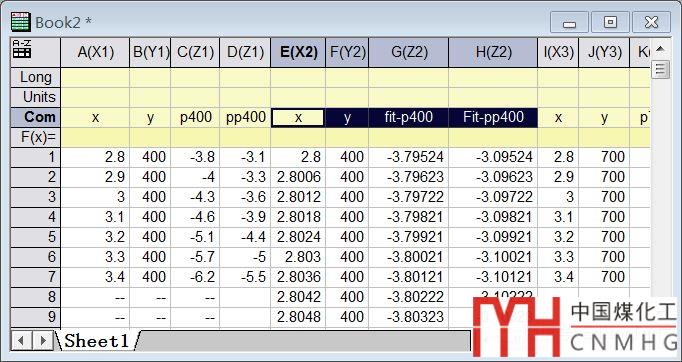 那么,我們將圖2中的擬合數(shù)據(jù),重新建立數(shù)據(jù)表,并整理如表3所示。當(dāng)然,只需要臨時(shí)繪制圖2中的單獨(dú)的每個(gè)子圖即可,不需要層管理放置同一個(gè)繪圖區(qū),也不需要調(diào)整圖文、圖例,因?yàn)橹皇抢眠@一步驟預(yù)處理數(shù)據(jù)(擬合數(shù)據(jù))。這里可省略同一張子圖中兩組散點(diǎn)的4列擬合數(shù)據(jù)(兩列X、兩列Y)中的X擬合數(shù)據(jù),即共用E(X2)擬合數(shù)據(jù)(如表3中藍(lán)色塊的x列)。然后新增一列y并將y列所有行都填充相同的Y值(如400),這里一定要將擬合數(shù)據(jù)的所有行的Y值賦值,否則繪圖的擬合曲線不完整。類似地,處理700和1000系列的擬合數(shù)據(jù)。
