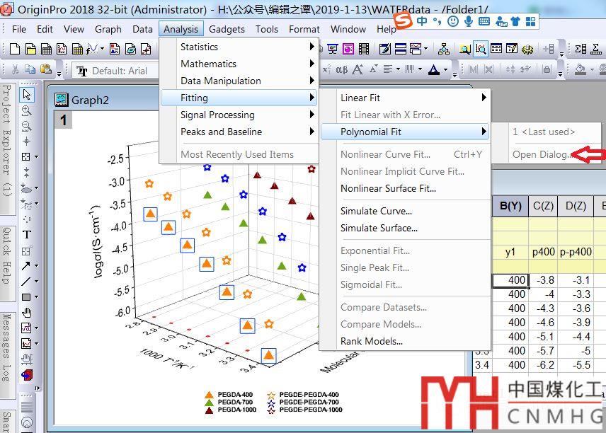 下面開始逐條擬合,點(diǎn)擊某條散點(diǎn)圖,點(diǎn)擊菜單Analysis→ Fitting→ Polynomial Fit→ Open Dialog... 或1<Last used>,如圖7所示。