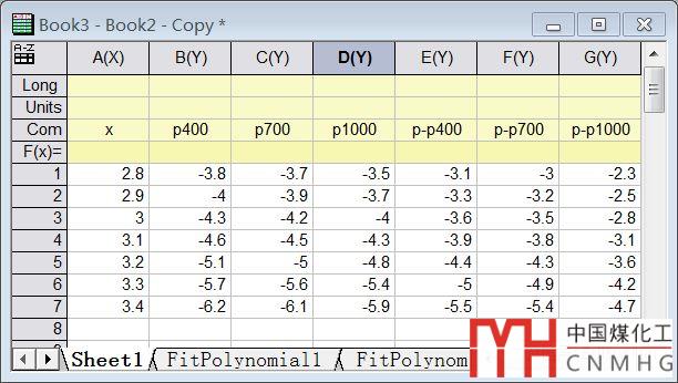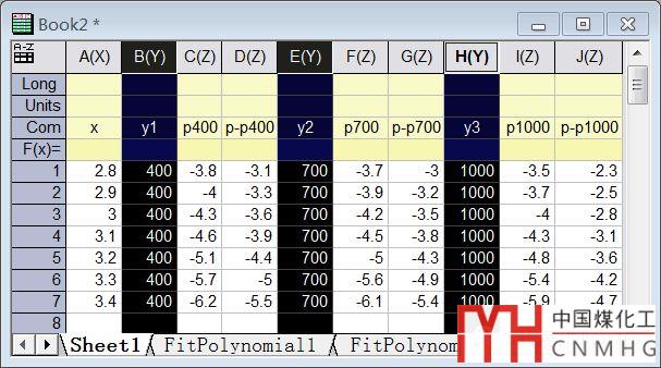 理清思路之后,利用3D Scatter圖繪制之前,需要新建一個(gè)數(shù)據(jù)表(請不要在原數(shù)據(jù)表中修改,這樣會(huì)破壞已經(jīng)完成的繪圖的),給表1中的每個(gè)系列數(shù)據(jù)中增加1列y1、y2、y3分別在表列中填充400、700、1000,并Set as Y。再將原數(shù)據(jù)的表列Set as Z。效果見表2。