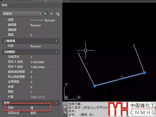 后來看了一下特性面板才發(fā)現(xiàn)了問題所在,雖然這些多段線只有一段直線,但閉合卻被設(shè)置成了是,如下圖所示。