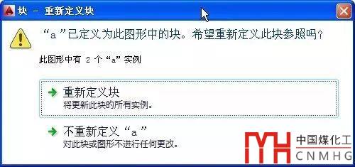 5、單擊確定按鈕,軟件會彈出是否重新定義塊的對話框,單擊"重新定義塊",更新圖塊的定義,如下圖所示。