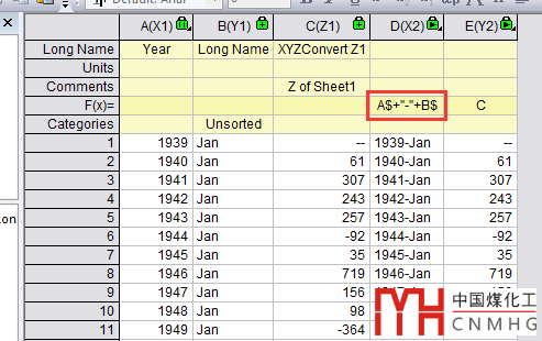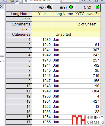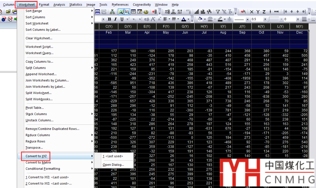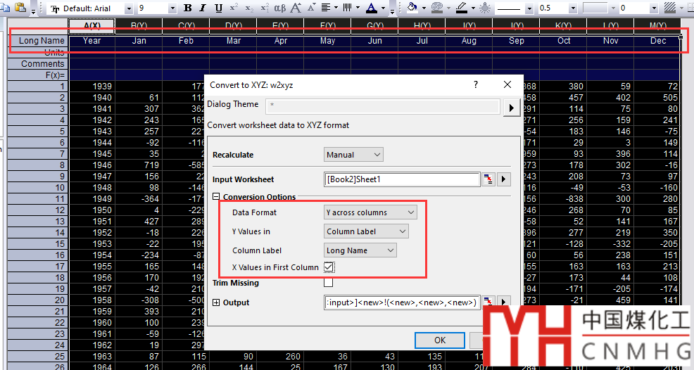Worksheeet菜單中打開(kāi)Convert to XYZ功能頁(yè)面。Data Format選為Y cross columns,Y Values in設(shè)為Column Label,Column Label選為Long Name(根據(jù)實(shí)際需求來(lái)設(shè)置),同時(shí)勾選X Values in First Column。
