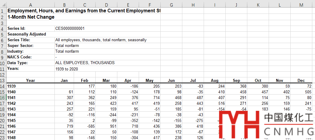 下載自美國(guó)勞工統(tǒng)計(jì)局(https://www.bls.gov/),下載的原始數(shù)據(jù)是`xlsx`格式,數(shù)據(jù)存儲(chǔ)形式為**寬格式**,即按月份來(lái)分列存儲(chǔ)的。