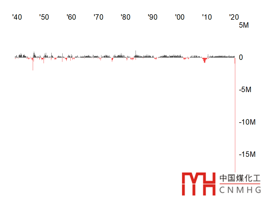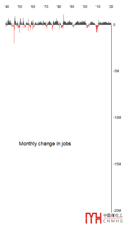 最近看到了一張圖,最初是發(fā)在The New York Times上。特別夸張的用一整個(gè)頭版,圖也一定要長(zhǎng),才能看清2020年4月份失業(yè)人數(shù)的陡增。這個(gè)圖除了夸張的對(duì)比,還有就是正、負(fù)方向上的不同著色。