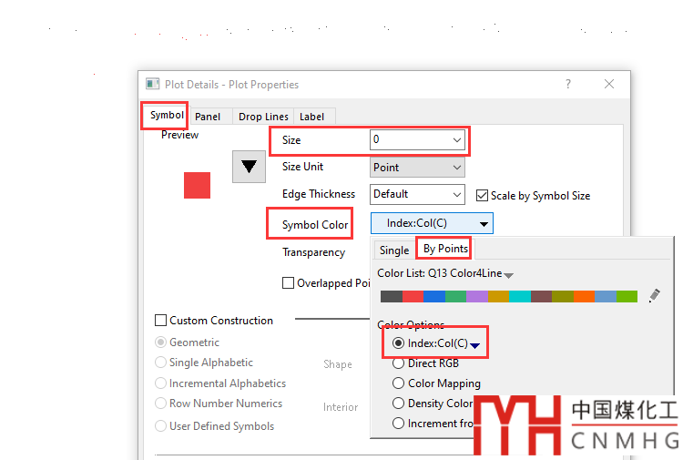 Plot Properties對(duì)話框,設(shè)置曲線格式。首先在Symbol頁(yè)面,將Size設(shè)為0,將Symbol Color設(shè)為By points,顏色選為Index,數(shù)據(jù)來(lái)源為分組數(shù)據(jù),即Col(C)。