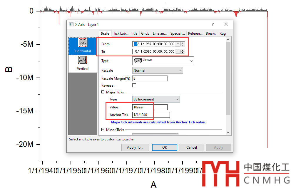 Scale頁(yè)面,設(shè)置合適的From和To,以及Major Ticks的值為10year,Anchor Tick設(shè)為1/1/1940,目的是將第一個(gè)坐標(biāo)軸標(biāo)簽設(shè)為1940年開(kāi)始,默認(rèn)的是1939年。