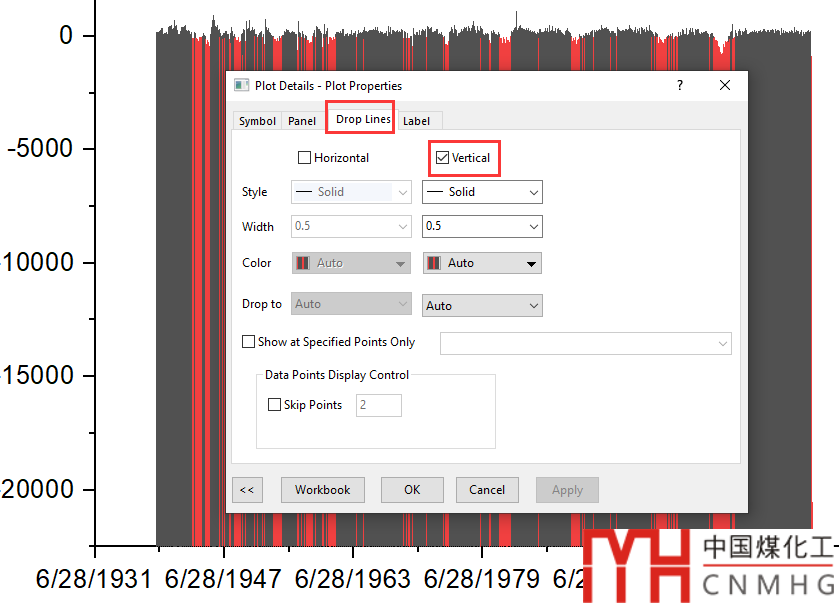 Drop Lines頁(yè)面,勾選Vertical,即顯示垂直方向上的垂線。此時(shí)垂線的Drop to是默認(rèn)為到Y=Axis Begin,在設(shè)置坐標(biāo)軸格式時(shí)會(huì)添加Custom Additional Line,即Y=0。