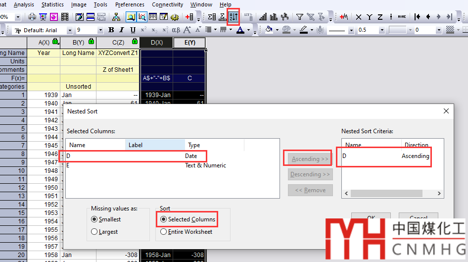 Selected Columns中選中D,使用Ascending按鈕將其添加到右側(cè)Nested Sort Criteria中,并勾選底部Sort下的Selected Columns,即對(duì)選中的列,以D列為依據(jù),進(jìn)行升序排列。