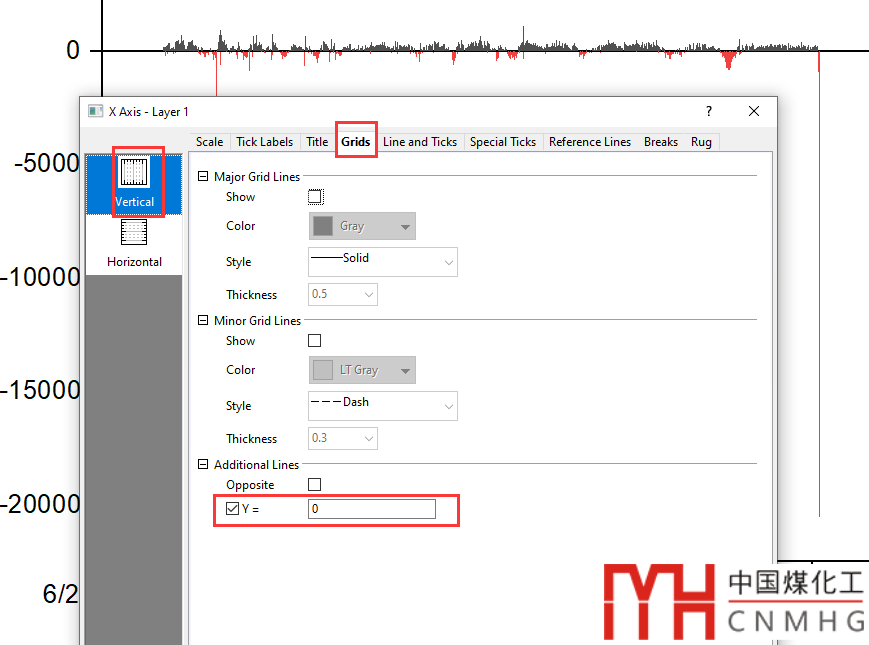 Grids頁(yè)面,勾選Additional Line下的Y=0,即垂足的位置,此時(shí)正、負(fù)方向上顯示了不同的顏色。