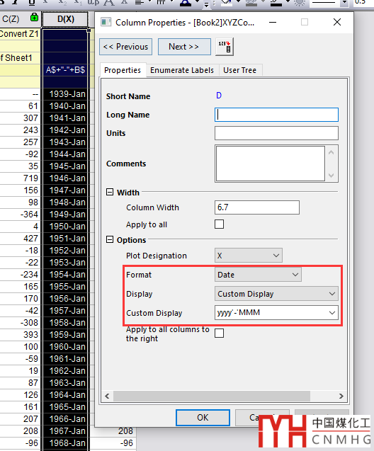 Properties,設(shè)置其數(shù)據(jù)格式為日期形式,根據(jù)當(dāng)前數(shù)據(jù),依次設(shè)為Date,Custom Display,yyyy'-'MMM。