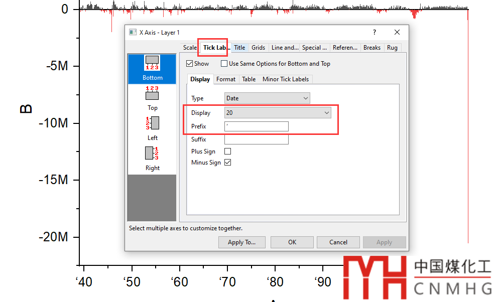 Scale頁(yè)面,將Display選為20,在Prefix里輸入',以簡(jiǎn)單的形式來(lái)表示年份。