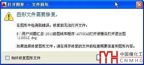 有時會出現(xiàn)提示框直接告訴我們圖形文件需要修復,如下圖所示。