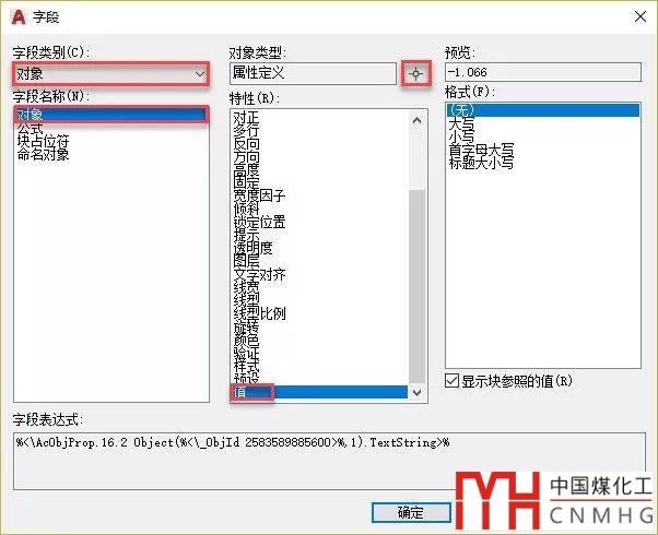 雙擊此圖塊會彈出增強屬性編輯器,選擇標(biāo)高屬性后,在屬性值框中雙擊之前設(shè)置的字段,重新打開字段對話框,如下圖所示。