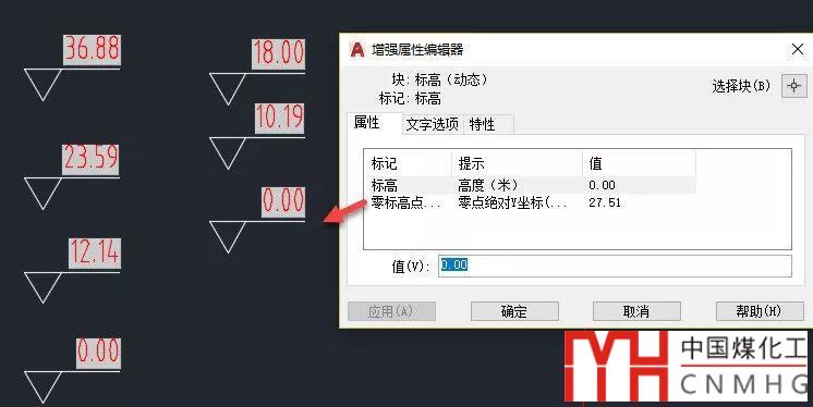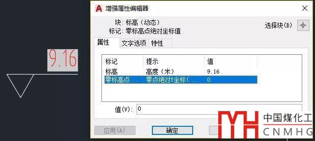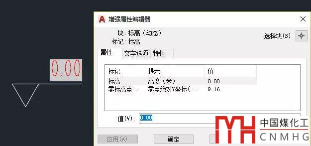 將剛才編輯過圖塊復(fù)制到圖中零標(biāo)高的位置,輸入RE回車,更新標(biāo)高值,然后雙擊圖塊打開增強屬性編輯器,在編輯器中可以看到計算出來的絕對標(biāo)高值,如下圖所示。