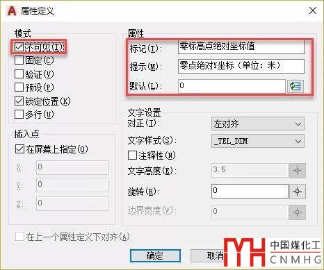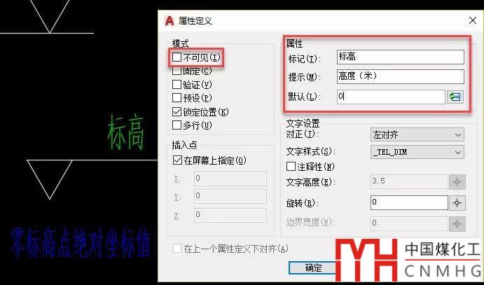 在定義標(biāo)高屬性前,先定義一個用來設(shè)置零標(biāo)高點絕對坐標(biāo)值的屬性,此屬性的標(biāo)記、提示可以根據(jù)自己的需要設(shè)置,默認(rèn)值可以先設(shè)置為0,由于這個屬性只是起設(shè)置零標(biāo)高值的,不需要顯示,所以在定義屬性時可勾選“不可見”,如下圖所示。