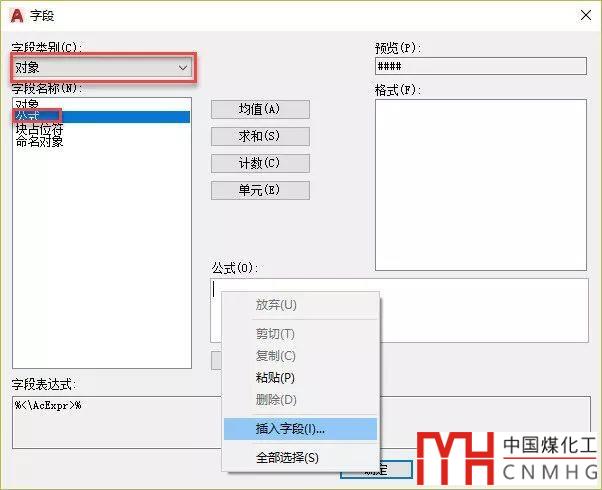 打開插入字段對話框后,在字段類型中選擇“對象”,然后在字段名稱中選擇公式,再到右側(cè)下方的公式輸入框中單擊鼠標(biāo)右鍵,在右鍵菜單選擇插入字段,如下圖所示。
