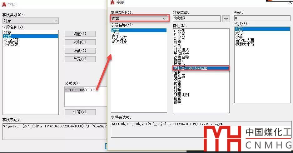 在公式后面輸入一個減號-,在減號后面右鍵并選擇插入字段,在新打開的字段對話框中類別仍選擇對象,名稱也選擇對象,單擊中間的“選擇對象”按鈕,在圖中拾取剛插入的標(biāo)高圖塊,然后在“特性”列表中選中之前設(shè)置的“零坐標(biāo)點絕對標(biāo)高”屬性,如下圖所示。