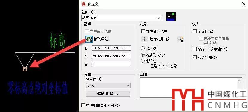 選中標(biāo)高的圖形和定義的屬性后輸入B,定義圖塊,給圖塊起好名字,必須要記住指定正確的基點,如下圖所示。