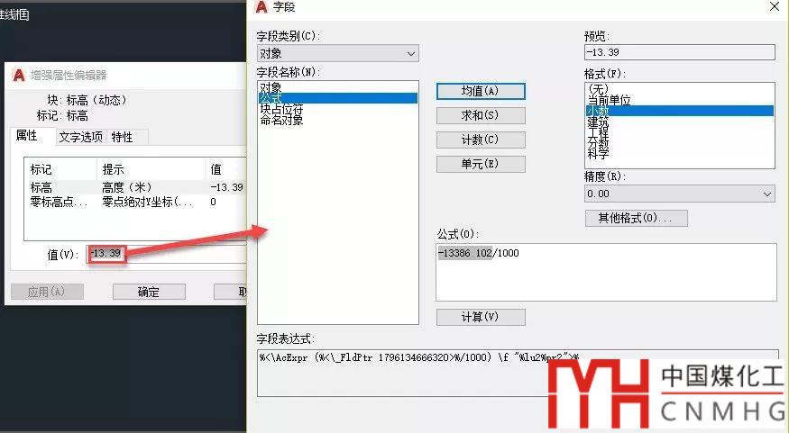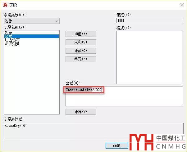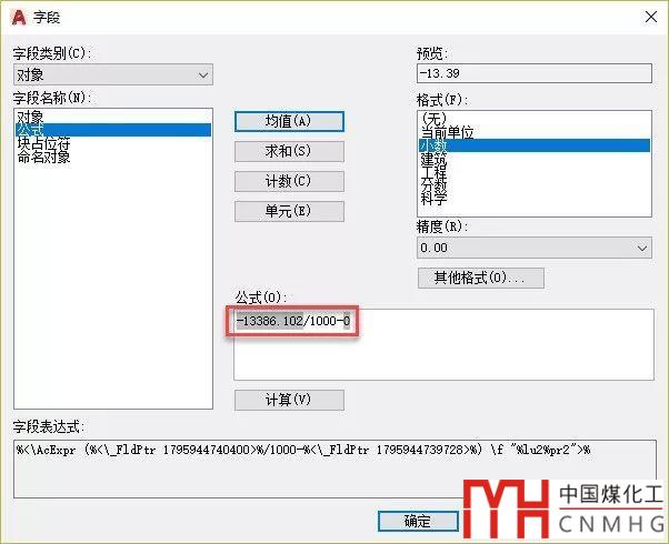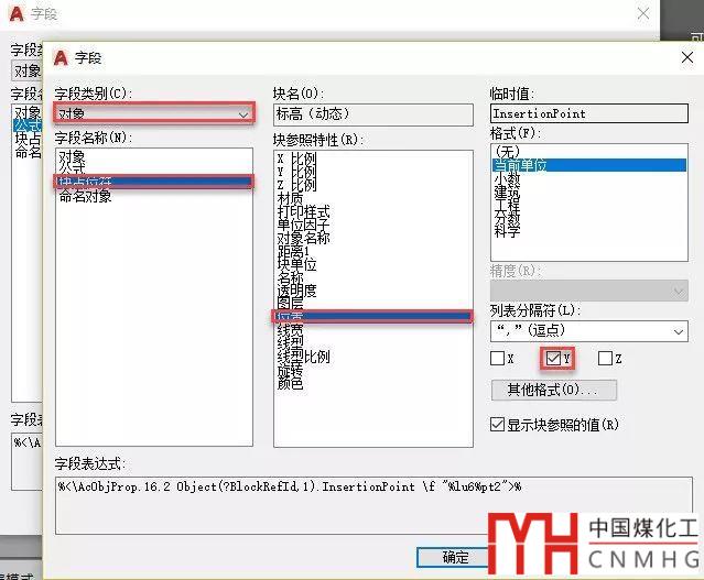 單擊確定按鈕可以返回上一級字段對話框,由于圖紙繪制的時候單位通常是毫米,而標(biāo)高需要標(biāo)注單位是米,需要在讀取的坐標(biāo)值上除以1000,因此需要在Y坐標(biāo)字段基礎(chǔ)上除以1000,如下所示。