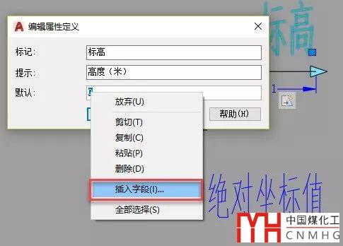 定義好圖塊后,選擇圖塊,右鍵選擇塊編輯器或者直接輸入BEDIT命令,進入塊編輯器,雙擊標(biāo)高屬性,彈出編輯屬性定義對話框,選中屬性值,右鍵,選擇插入字段,如下圖所示。