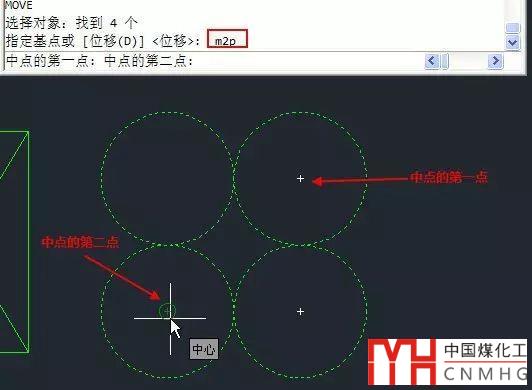 M2P的意思就是兩點(diǎn)的中點(diǎn)(Middle of 2 Points),可以將光標(biāo)定位到拾取的兩個(gè)點(diǎn)之間連線的中點(diǎn)位置,以為這四個(gè)圓是中心對稱的,我們就沒有必要再連對角線找中心點(diǎn)了。