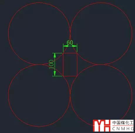 繪制如圖所示的圖形。要求中間的矩形尺寸為100×60。外面的四個(gè)圓相切。