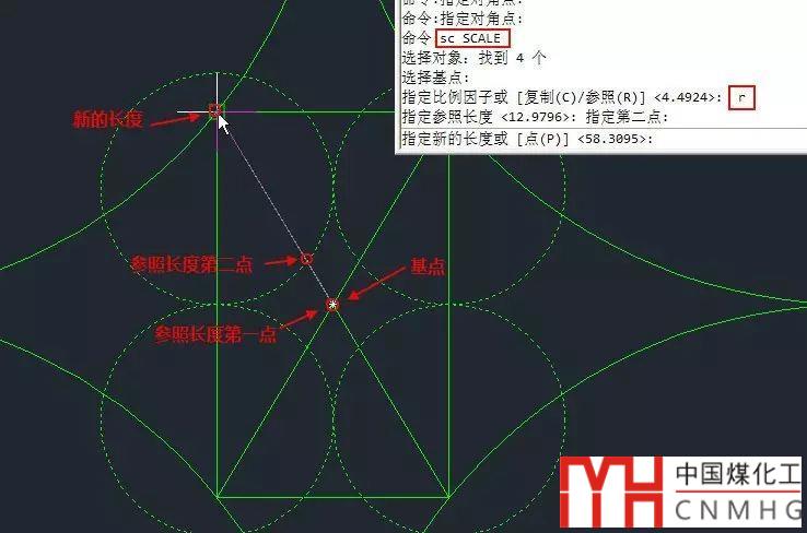 很多人看到這張圖知道要用縮放命令來完成,關(guān)鍵是要在未知圖形中找出已知圖形的相似圖形,才能知道參照長度和新長度,這張圖就是利用了矩形的對角線作為輔助線,利用對角線與圓的交點(diǎn)。
