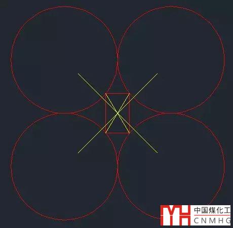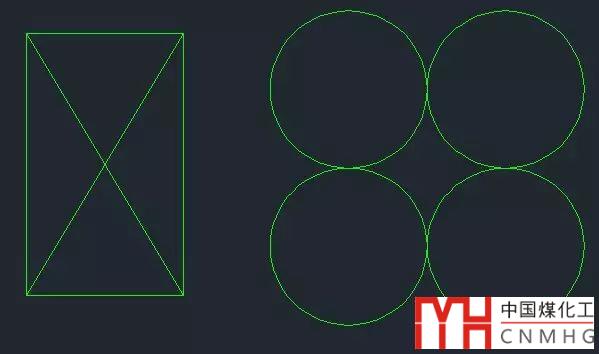 下面我們就要利用SC命令來縮放四個(gè)圓了,當(dāng)我們將圓和矩形移到一起后就會(huì)發(fā)現(xiàn),如果連接矩形的對角線與四個(gè)圓的交點(diǎn),得到的矩形應(yīng)該跟我們繪制的矩形是相似的,我們可以把它作為基準(zhǔn)來縮放圓,當(dāng)將這個(gè)矩形放大到跟我們繪制的矩形一樣大的時(shí)候,圓就可以滿足要求了。