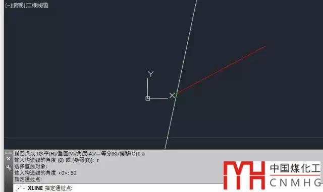 輸入XL,回車,輸入A,回車,輸入R回車,選擇圖中的直線,角度輸入50,然后再圖中指定一個點來確定構造線的位置,如下圖所示。