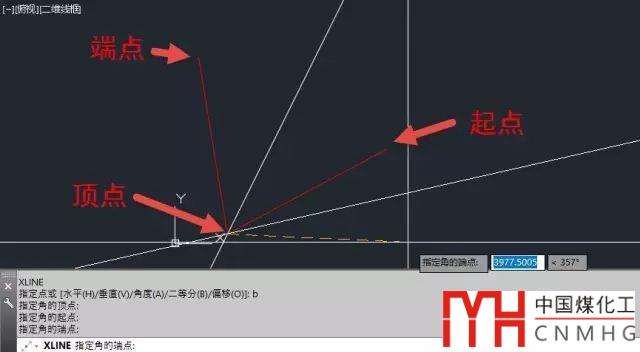所謂二等分就是角平分線,創(chuàng)建方法也很簡單,輸入二等分參數B后,設置好角的頂點、起點和端點,就可以創(chuàng)建出角平分線。如果多個角度的起始角相同,可以連續(xù)創(chuàng)建,多次指定端點,如下圖所示。