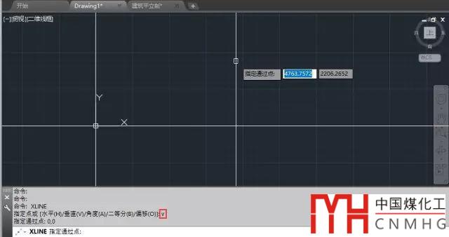輸入V,回車,輸入0,0,在原點處創(chuàng)建一條垂直的構造線, 如下圖所示。
