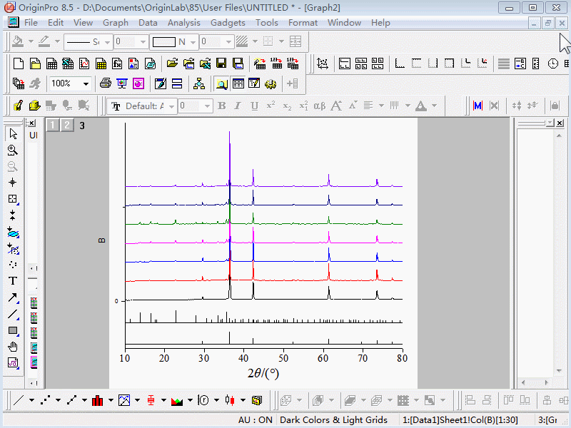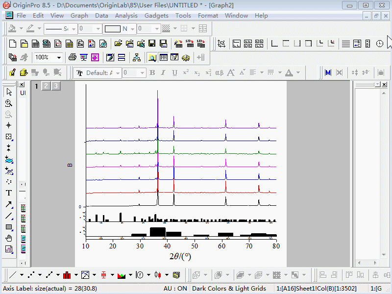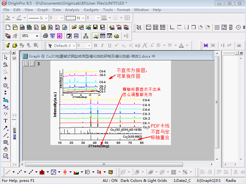 這就結(jié)束了?那原稿圖中的插圖怎么辦?我說(shuō)過(guò),會(huì)單獨(dú)作圖,而且這個(gè)插圖是上圖中10°~35°范圍的,這個(gè)范圍的衍射峰很弱,怎樣放大?修改縱坐標(biāo)范圍?這是不行的。難道要重新去XRD儀器上再掃描一遍?別!別!別!我的學(xué)生都已經(jīng)畢業(yè)了,我們的樣品也用完了。