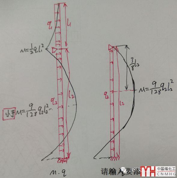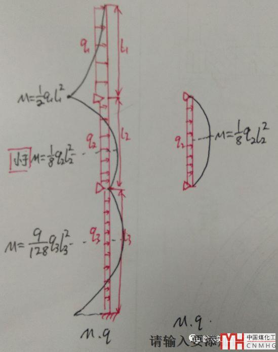 3)如果是設(shè)置2個(gè)導(dǎo)向支撐,導(dǎo)向支撐之間的最大彎矩是可以保守計(jì)算的。導(dǎo)向支撐和基礎(chǔ)間的彎矩也是可以保守計(jì)算的。L2和L3段筒體的各截面順風(fēng)彎矩直接用相應(yīng)段的保守的最大彎矩替換。注意兩個(gè)導(dǎo)向支撐之間的最大彎矩可相對精確計(jì)算也可以保守(開始手寫了個(gè)相對精確的彎矩用到了l1/(l1+l2)看著煩又刪了,還不如直接保守點(diǎn)計(jì)算簡單)見下圖為了方便對比和理解將載荷分為三段手畫了彎矩圖。