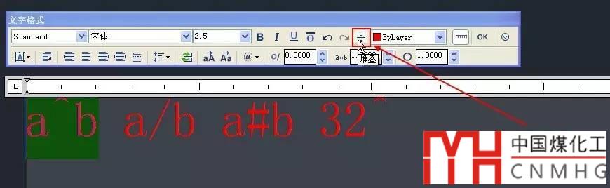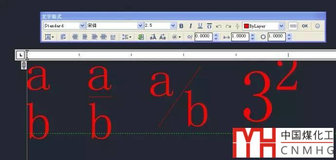 如果要輸入平方、立方這樣的上下標,或者要輸入分數(shù),可以利用CAD多行文字的堆疊功能,也就是多行文字編輯器對話框中b/a的按鈕。
