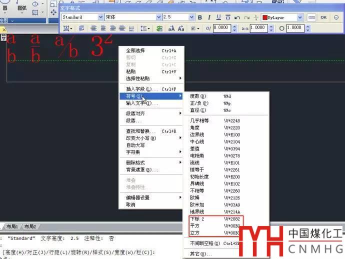 如果輸入公差,堆疊文字顯然是最好的選擇,如果只是單純的平方、立方,用堆疊輸入就比較麻煩了。平方和立方還有更簡單的輸入方法,在多行文字編輯器中右鍵,在右鍵菜單的“符號”列表中可以找到平方、立方等很多符號,直接從列表中選取就好了,如下圖所示。