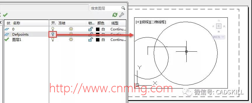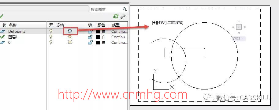 視口無法顯示和選中的問題很容易重現(xiàn):我在AUTOCAD 2018中新建了一張簡單的圖紙,新建了一個圖層1,在圖層1上畫了幾個圓和標注,然后切換到布局,將視口移動了DEFPOINTS圖層(這個其實不重要),只要視口不在0層就行。