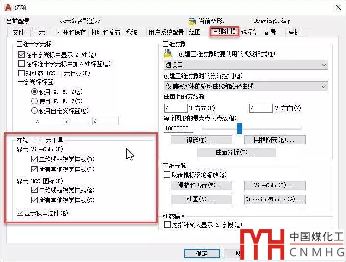 這里除了設置ViewCube和UCS圖標在二維現(xiàn)況模式或其他視覺模式是否顯示的選項外,下面還有一個顯示視口控件的選項是用于控制是否在視圖左上角顯示視圖和著色方式的。