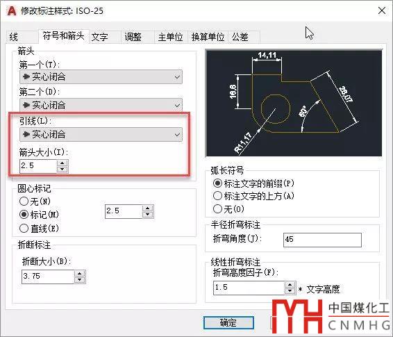 在標(biāo)注樣式對(duì)話框中選中引線使用的標(biāo)注樣式,單擊修改按鈕,切換到“符號(hào)和箭頭”選項(xiàng)卡,可以看到專(zhuān)門(mén)針對(duì)引線的箭頭形式設(shè)置,箭頭大小也是對(duì)所有形式標(biāo)注的,包括引線標(biāo)注,如下圖所示。