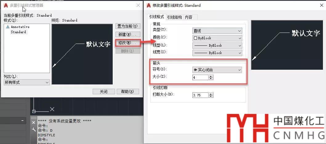 而多重引線樣式則不受標(biāo)注樣式的控制,有專(zhuān)業(yè)的多重引線樣式MLEADERSTYLE的設(shè)置,可以單獨(dú)設(shè)置箭頭的樣式和大小,如下圖所示。