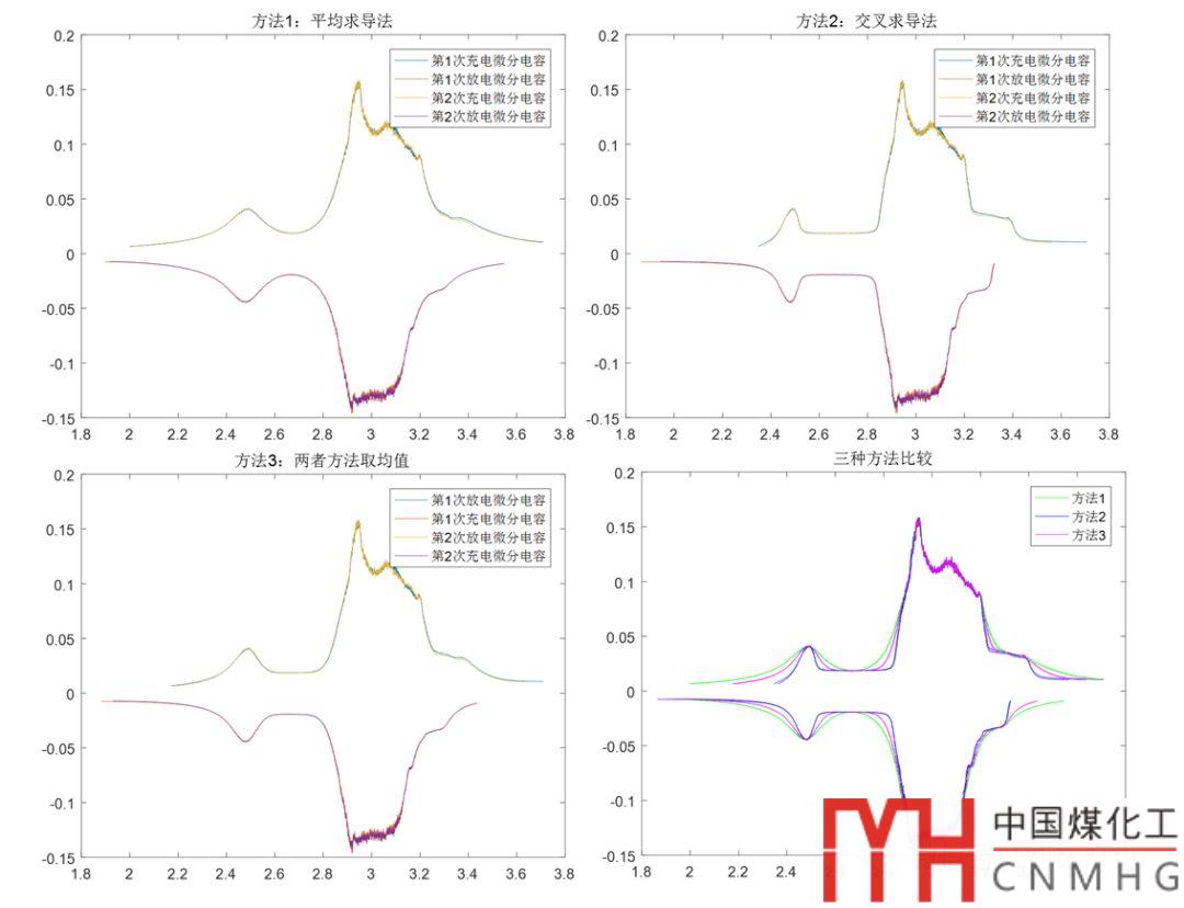 采用譚編提出的平均求導(dǎo)(方法1)和交叉求導(dǎo)法(方法2),以及筆者綜合考慮這兩種方法的誤差而提出的均值法(方法3),即對兩種方法的計(jì)算結(jié)果再次求均值的方法,對比研究并驗(yàn)證這3種方法對電池充放電曲線求解微分電容曲線的科學(xué)性、準(zhǔn)確性、可行性。同時(shí)對磷酸鐵鋰單平臺、多平臺特征的充放電數(shù)據(jù),以及多次循環(huán)數(shù)據(jù)進(jìn)行了一鍵處理,驗(yàn)證其可行性。