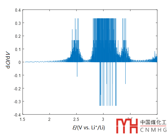 不少同學(xué)參考這些文獻(xiàn)方法,試圖得到類似的微分容量曲線,但是,實(shí)際上會遇到很多困難。要么不知道怎么得到,要么在利用Origin繪圖軟件進(jìn)行微分處理時(shí),得到的一定是類似下圖的奇怪結(jié)果。