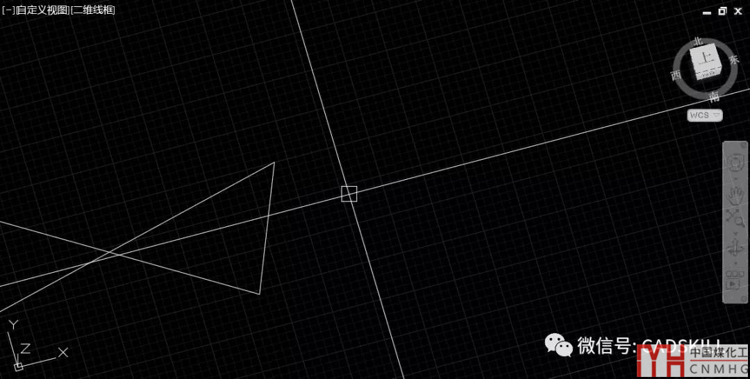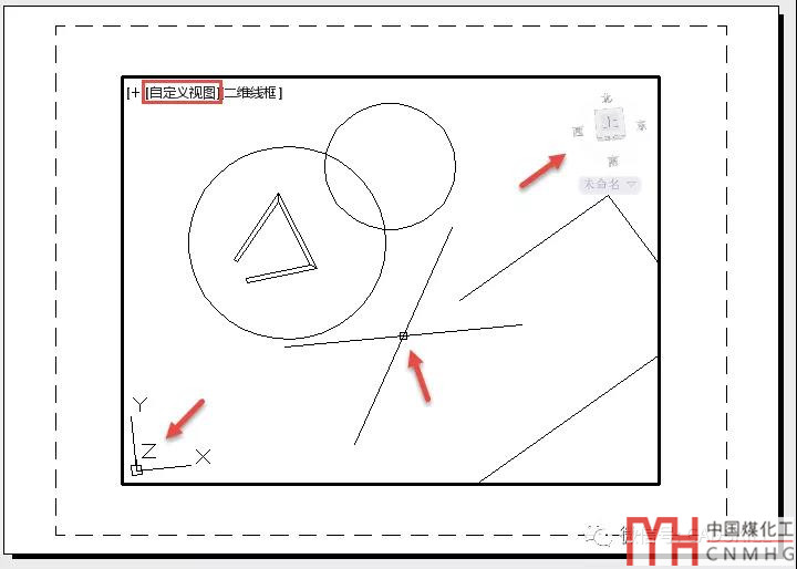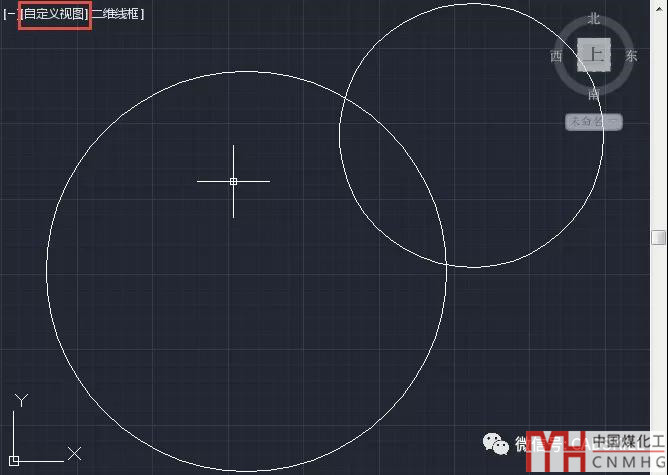 如果CAD版本比較低,能看到的就是十字光標和UCS圖標的變化,在高一點的版本,其實我們還可以看到視圖變成了“自定義視圖”和右上角的VIEWCUBE也變傾斜了。