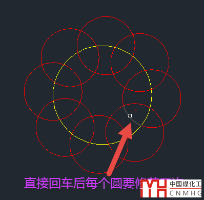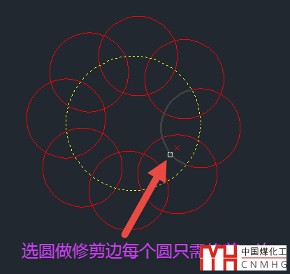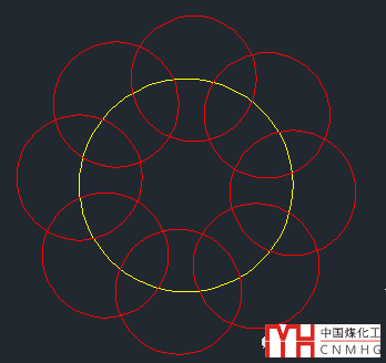 在多數(shù)情況下我們直接回車用所有圖形作為修剪邊界是很方便的,但并不適合所有情況。假如要修剪的部分有多個(gè)與其他圖形的交點(diǎn),那就不如老老實(shí)實(shí)選擇修剪邊界,比如我們要修剪下圖中黃色圓內(nèi)所有的圓。