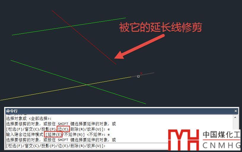 如果對(duì)修剪命令行的選項(xiàng)了解的話就不覺得奇怪了,默認(rèn)狀態(tài)下,圖形只有在圖面上實(shí)際相交才能修剪,但修剪和延伸命令有一個(gè)修剪邊延伸和不延伸的設(shè)置,默認(rèn)為不延伸,如果被設(shè)置為延伸,也就是圖形會(huì)被修剪邊的延長(zhǎng)線修剪。