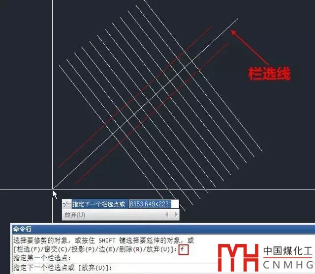 如果要修剪兩條相隔比較近的線中間的圖形,尤其邊界線傾斜的時(shí)候,如下圖中要修剪兩條紅線之間的白線,用F就方便了,輸入F后,拉一條斜線,就中間的線全部修剪掉了。
