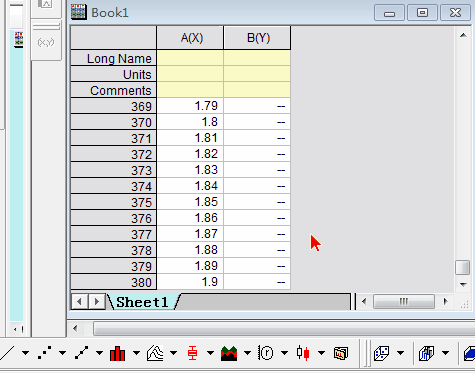 獲得-1.9~1.9的100個(gè)點(diǎn)的X數(shù)據(jù)。在數(shù)據(jù)表的A列表題上右鍵“set column values”(或按Ctrl+Q),行號(hào)Row(i)從1到760;公式編輯器中輸入:
