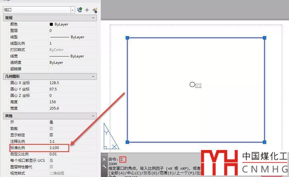 如果我們的圖紙需要按1:100打印,進(jìn)入布局后,雙擊進(jìn)入視口,輸入Z,輸入0.01XP,視口比例就被設(shè)置成了1:100,這種方法有時(shí)比在特性面板或狀態(tài)欄、工具欄設(shè)置比例更快,如下圖所示。